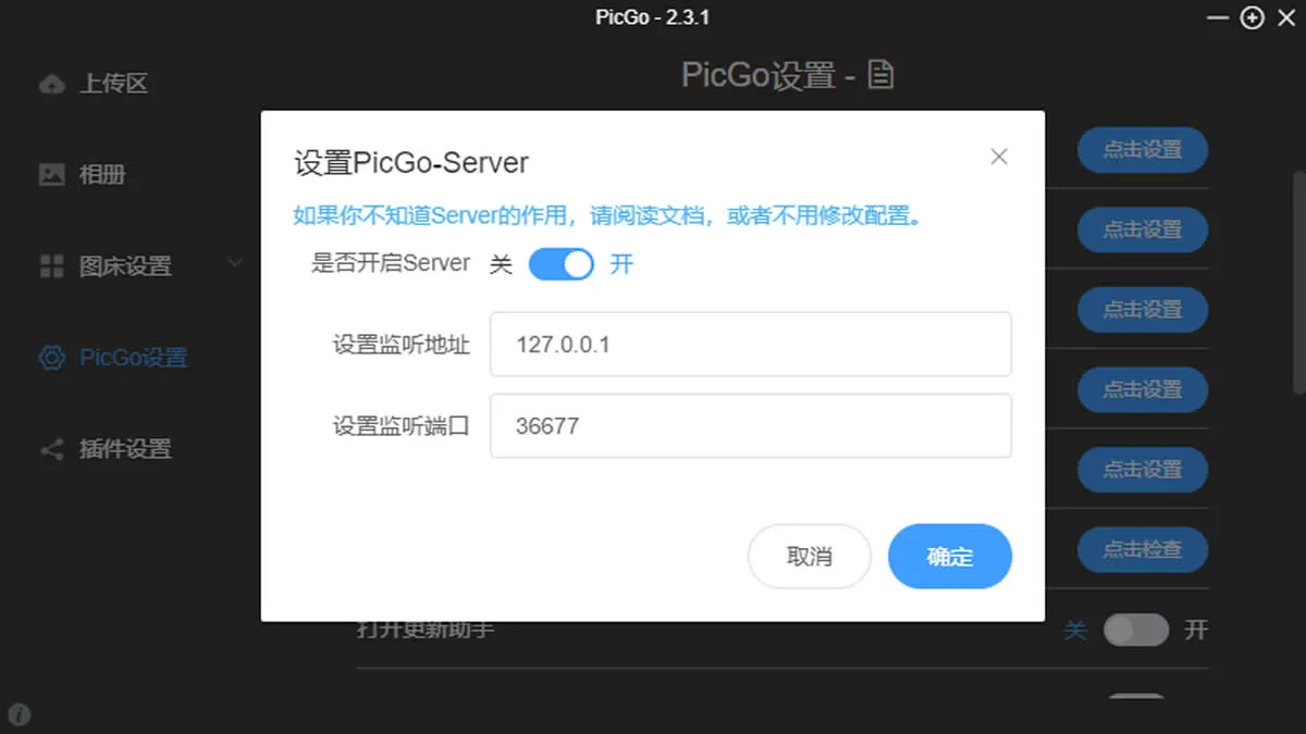 在这里设置PicGo-Server的作用,就是为了更好地监听端口,方便后面的Typora使用picgo上传图片,记住端口号是重点,如果和Typora的端口号不一致,就会出现报错,报错代码: