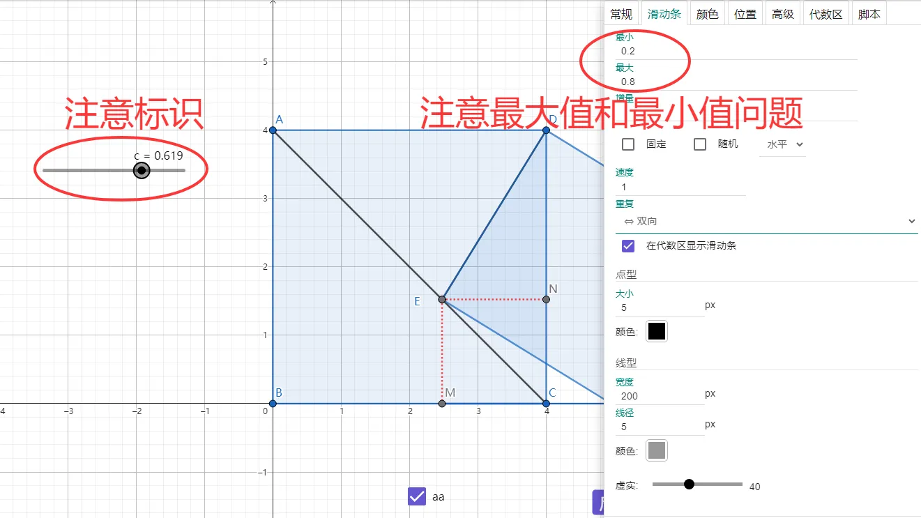 然后我们需要添加一个滑动杆,也就是滑动条,在这里需要适当的设置滑动杆的最大值和最小值问题,它也有些调控动点滑动位置的含义
