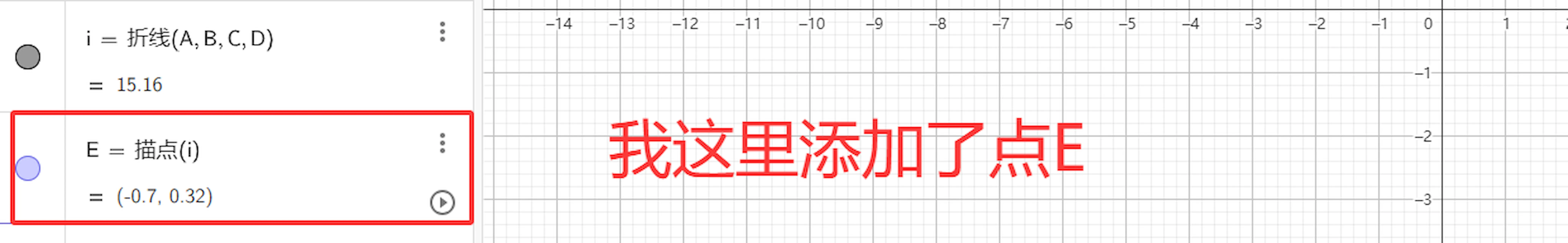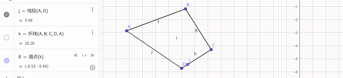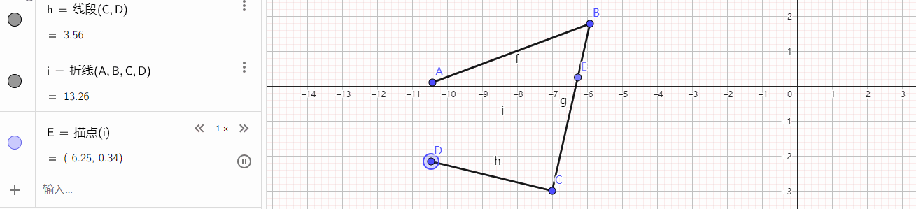 按照给出的字母顺序,我这里添加了一个点E,我们鼠标点击播放动画的按钮,就会发现这个点沿着折线运动,我的网站对动态图不友好,不容易展示出来。