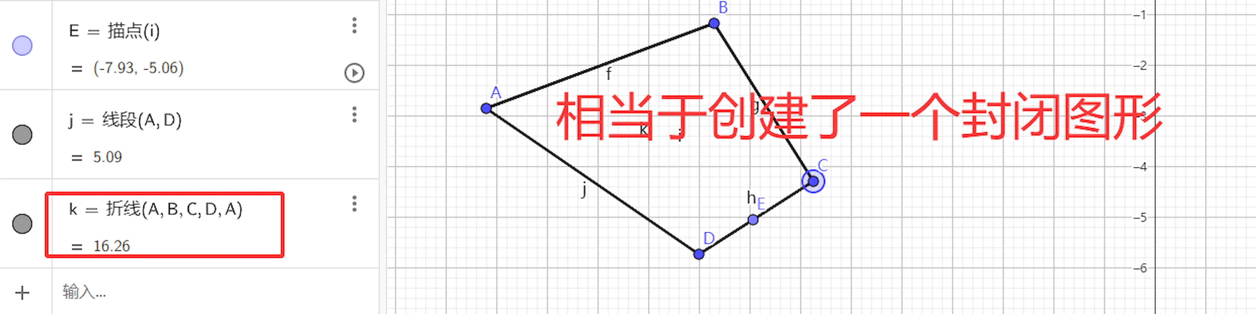 然后我们修改点E的信息,将括号中的折线 i 替换成折线 k,来看截图,还是那句话,我的网站网速不好,对动态图gif不友好,多刷新两遍。