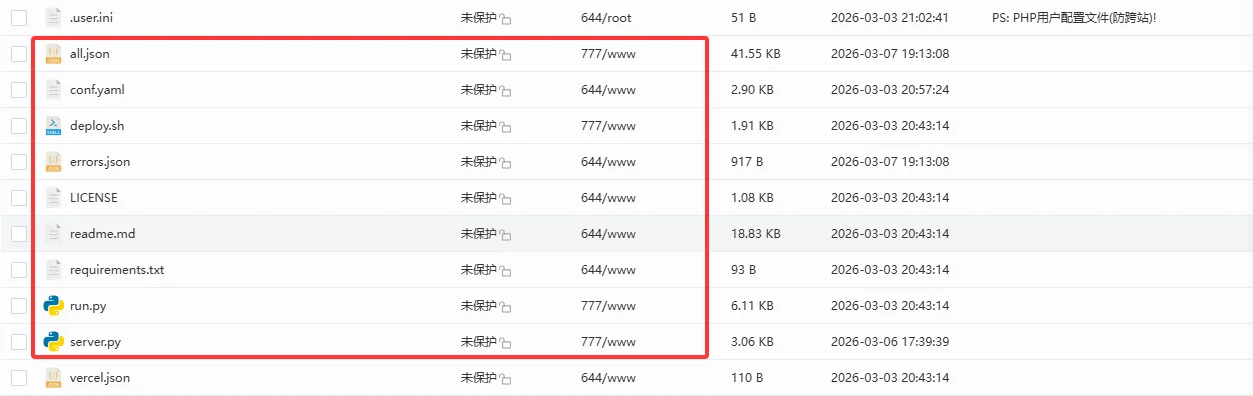 虽然提示爬取成功,实际上并没有成功,如我们在宝塔面板中查看 all.json 文件的时间,是不会发生变化的,主要因素是 Python 缺少运行模块,至少我这里报错是缺少模块,至于什么样的错误,还是要看个人的安装环境,按照 SSH 提示进行安装就可以。真正的爬取结果应该是如下