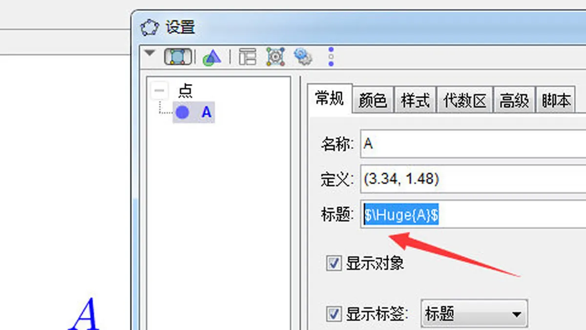 老刘博客今天我用GeoGebra做课件的时候,想着修改一下标签字体的大小,现在的6.0版本好像没有之际调整标签字体大小的地方,需要使用相关的代码来进行字体大小的调整。例如我们来调整A点标签的字体大小,需要如下操作: