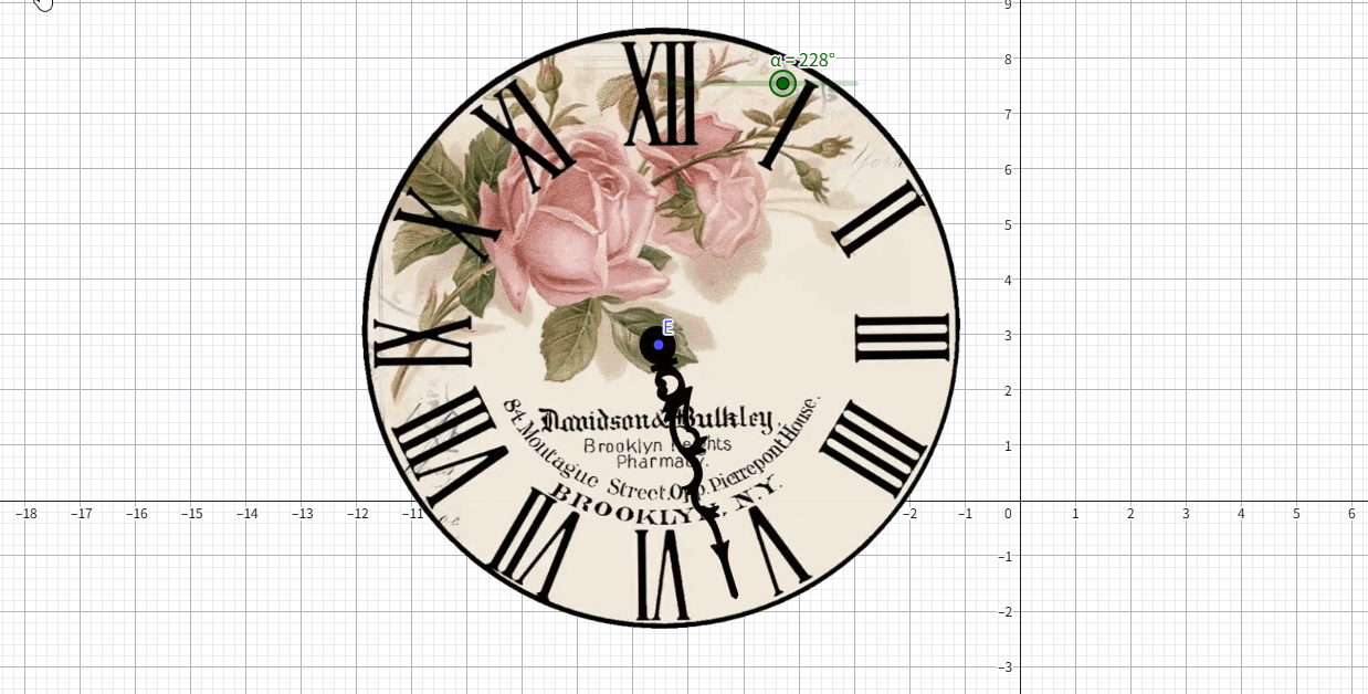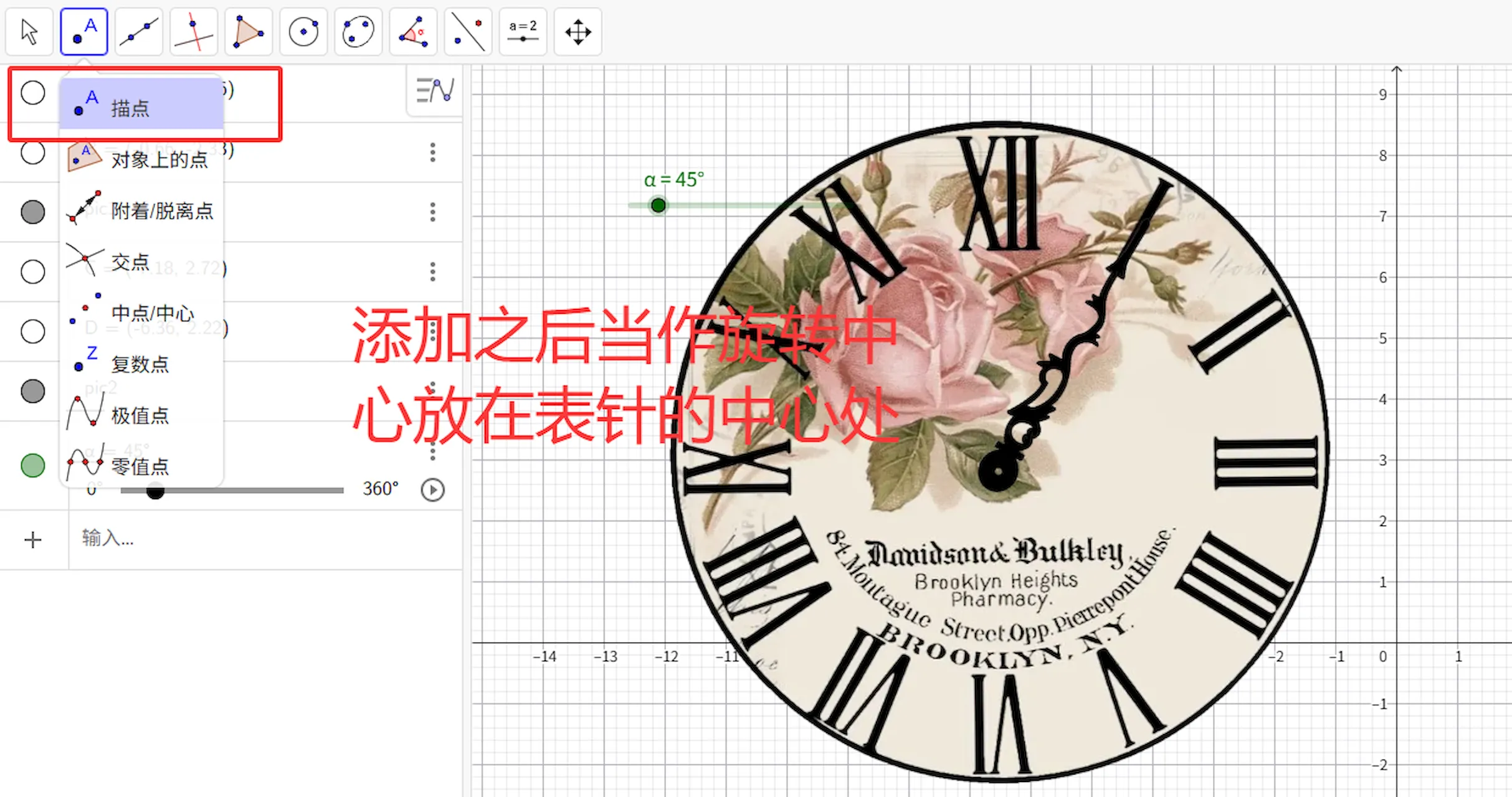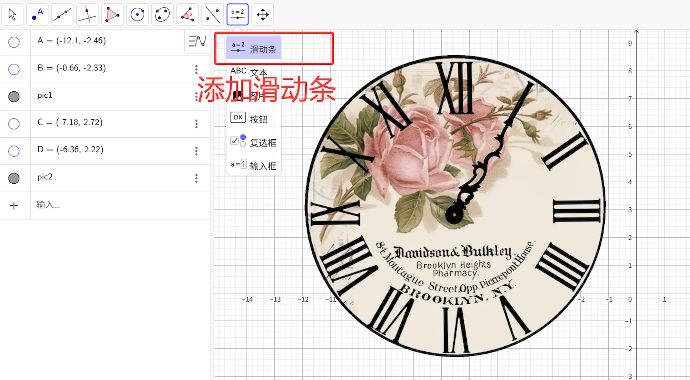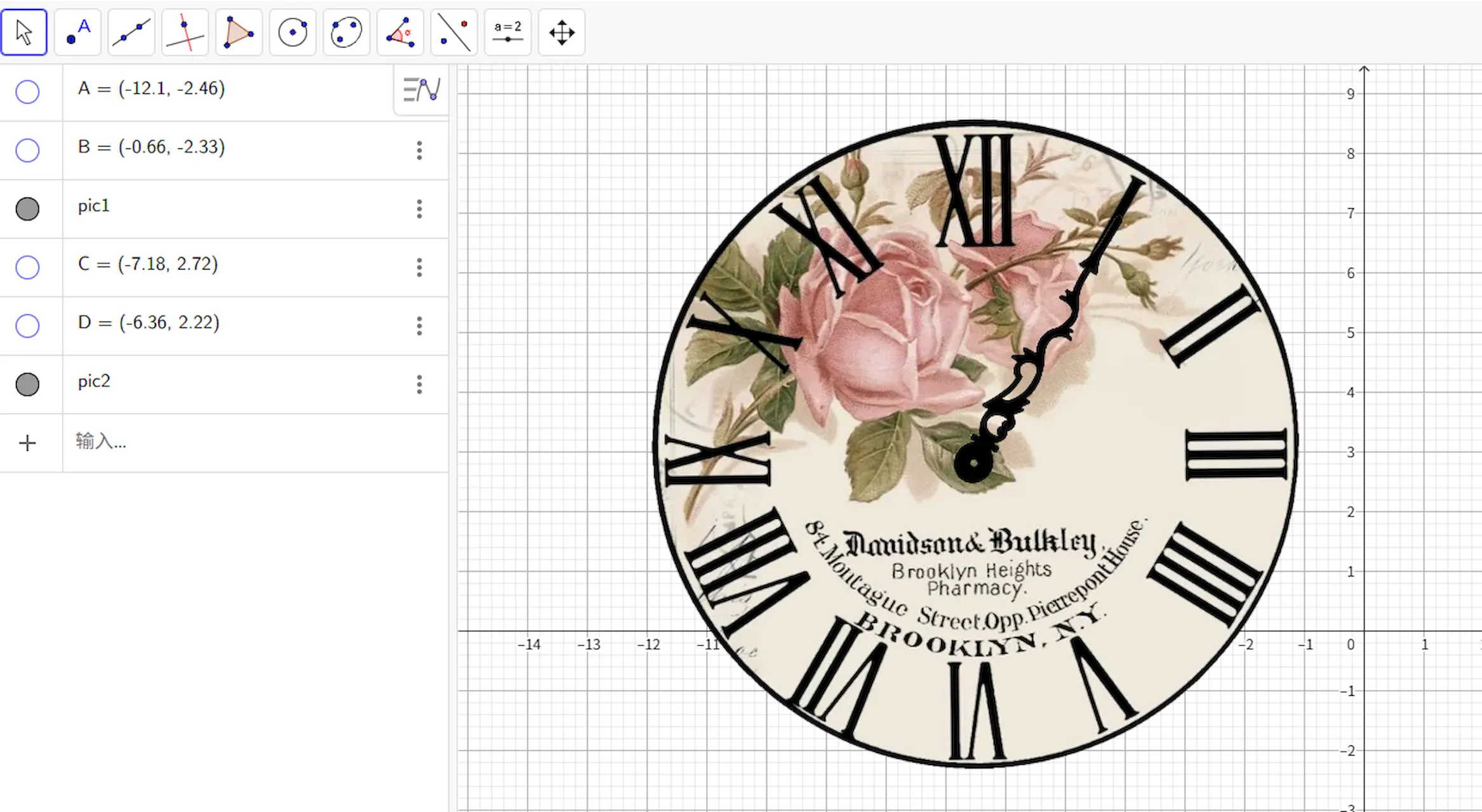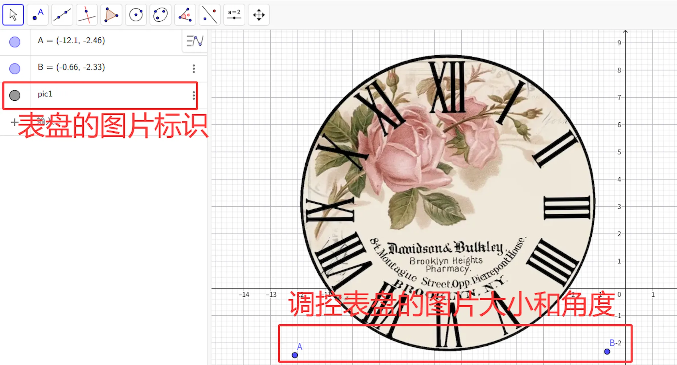 此时代数区显示了图片的标识为pic1,绘图区显示了我们添加的表盘图片,拖动地下的A点或者B点,会缩放图片的大小,也可以移动图片的位置。同样的方法我们再把分针图片添加进来。