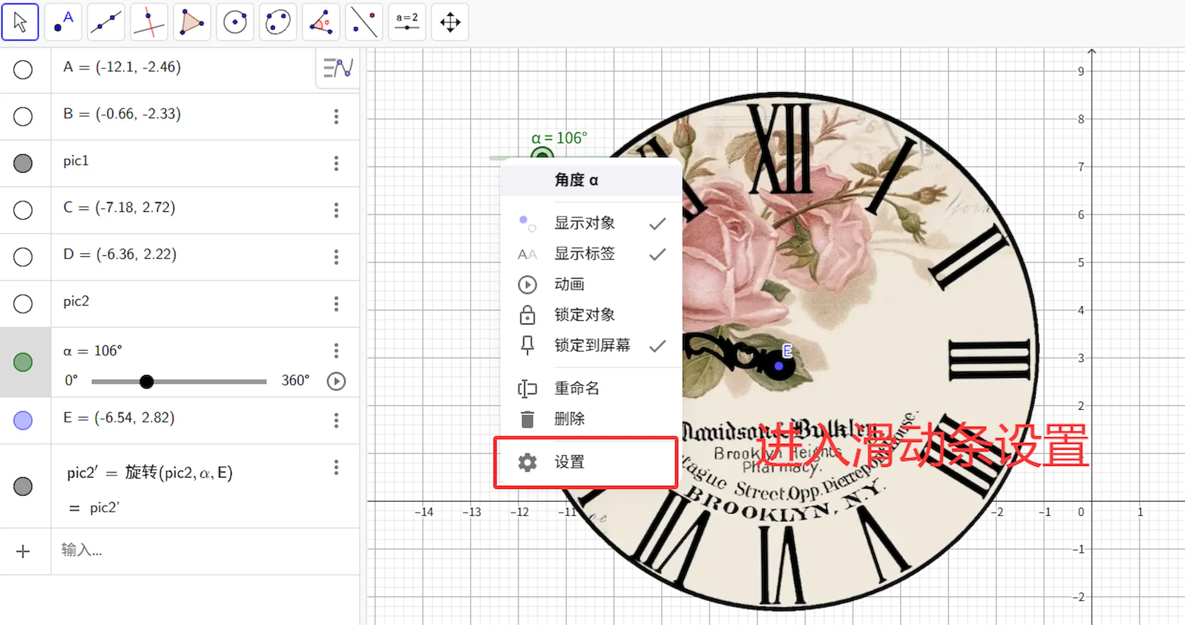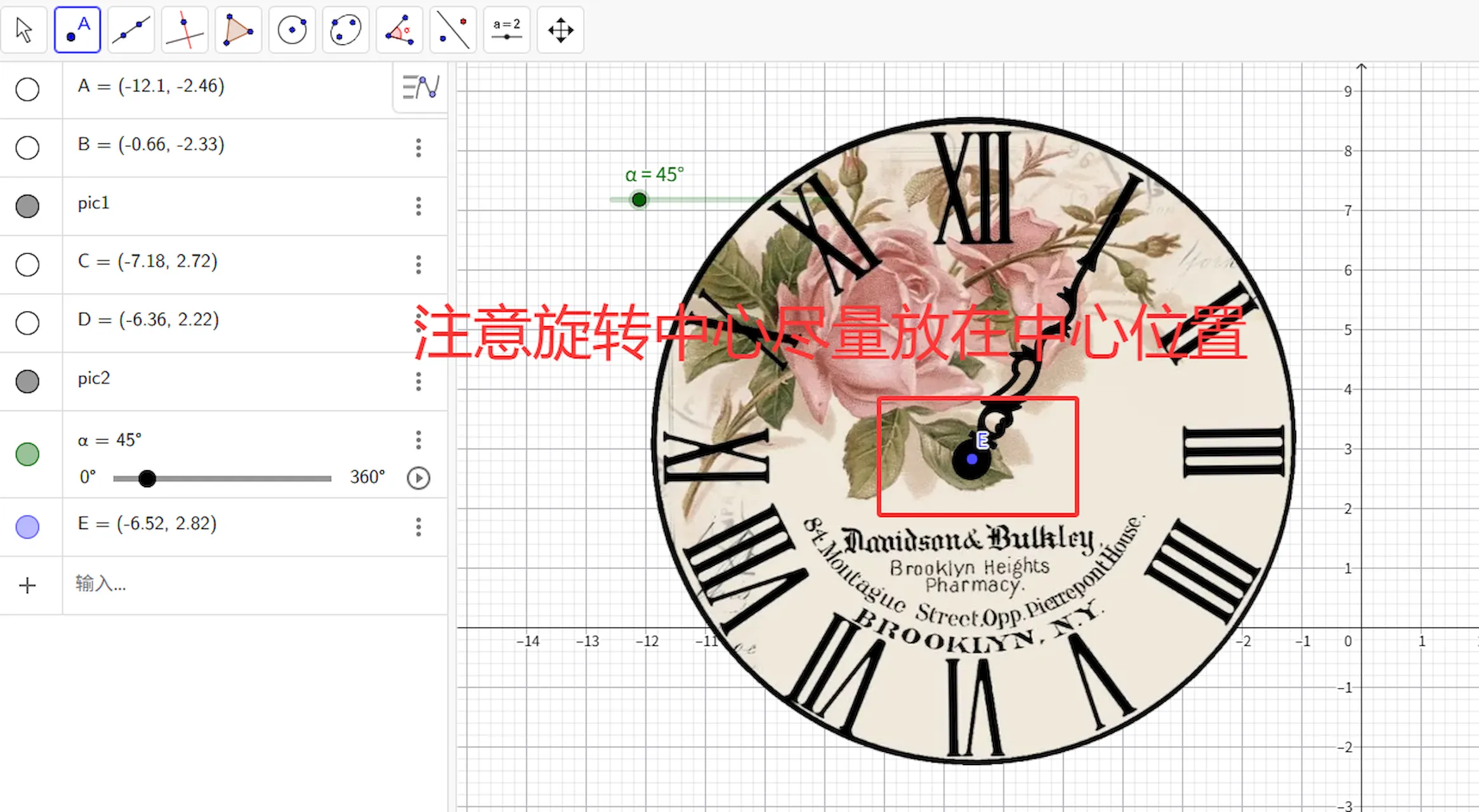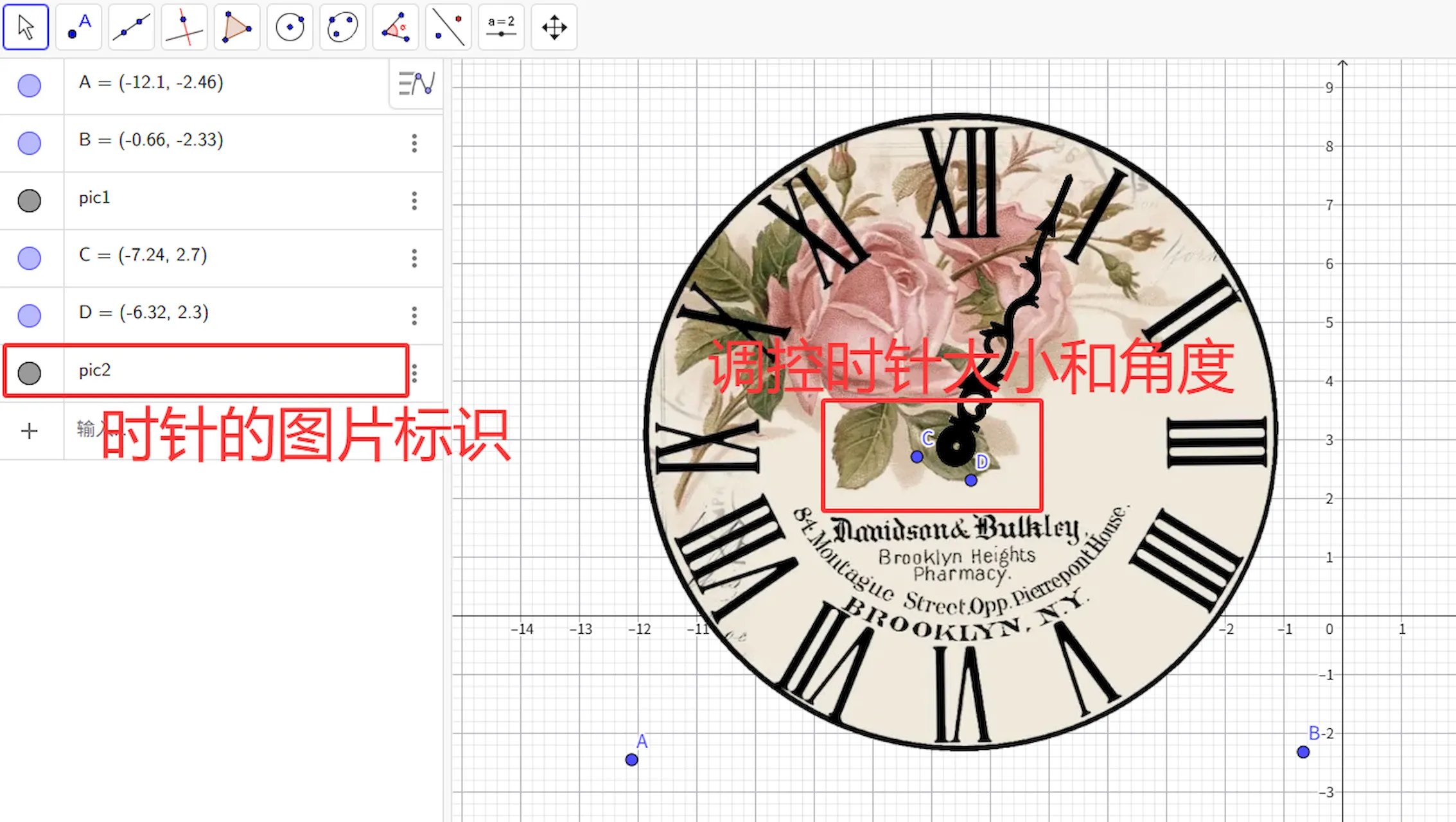 代数区会显示分针的标识为pic2,同样会出现类推的两个点C点和D点,此时拖动这两个点,会缩放图片的大小和改变图片的位置,尽量把分针图片放在适当的位置上,不然旋转起来会偏差很多。点击代数区中的元素,将不需要的对象隐藏掉。