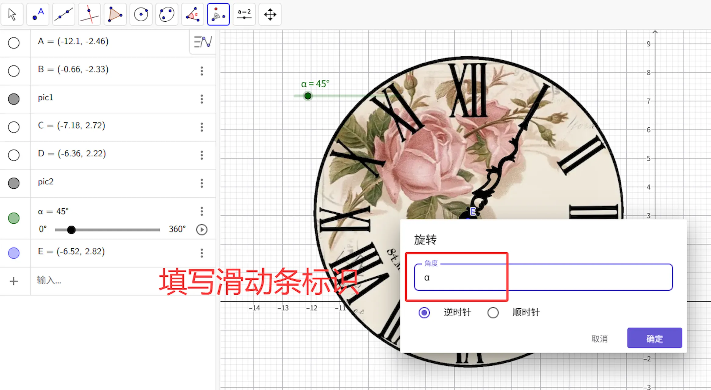 我们在这里选择的角度类型,最小值是0°,最大值是360°,当然也可以选择数值型,最小数值为0,最大数值为1,此时需要将滑动条的名称复制好,这个角度符号不好打出来,然后点击确定,添加滑动条,在添加一个点,当作旋转中心。