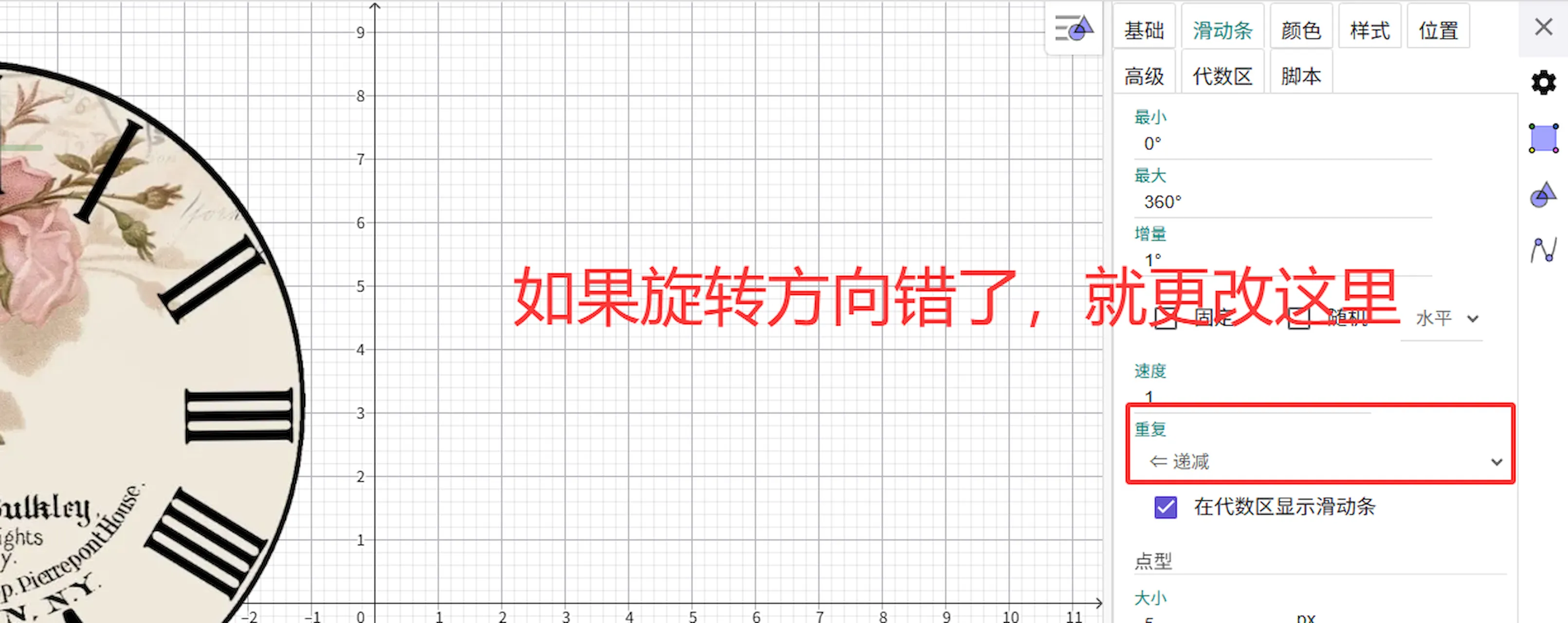 到这里,时针旋转的动画就完成了,点击滑动条的动画播放按钮,看一下是不是顺时针旋转,如果不是,就需要设置滑动条,点击滑动条属性,