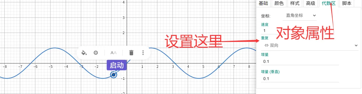 可选:在对象属性的 动画页将“重复”设为 双向,实现来回往复。当前这个动点A的往复运动范围以屏幕为边界,至少我测试的时候是如此。