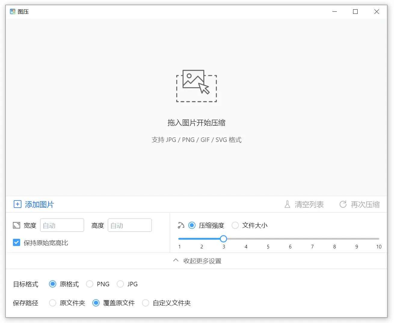 - 更快的压缩速度:与在线工具相比,图压使用本地运行的压缩引擎,压缩更快更高效。