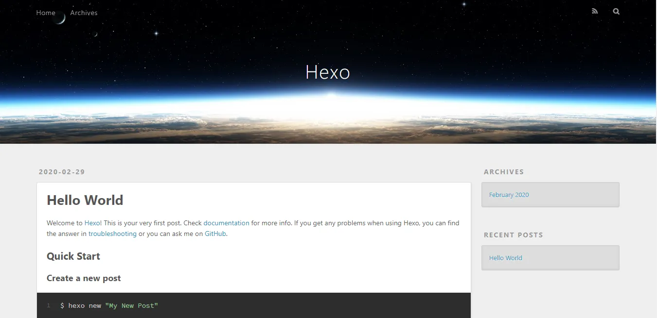 当然了,这仅仅是我们网站的初始界面,是一个默认的界面,这个网站虽然丑陋,毕竟是迈开了个人博客搭建部署的一大步,完成了网站部署之后,就需要进行我们的文章添加了,正所谓Hexo博客的安装简单,但是后期的问题也不复杂,毕竟我们有很多的插件和主题模板供我们选择。