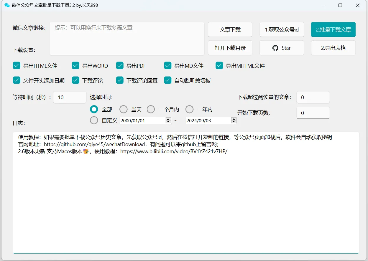 老刘博客今天给大家推荐一款非常不错的微信公众号文章批量下载工具,支持图片、评论下载,支持保存格式也很丰富,例如常见的html/mhtml/md/pdf/docx文件,特别是经过测试,保存文件真的包含md格式,估计使用Typora的小伙伴知道这种格式文件的好处,就可以直接经过编辑上传为自己的文章。当前软件的版本为3.2,而且在B站上也有专门的教程来介绍,但是不知道为什么视频教程是2.6,但是真是软件版本是3.2,感兴趣的小伙伴可以自己去查阅和观看。