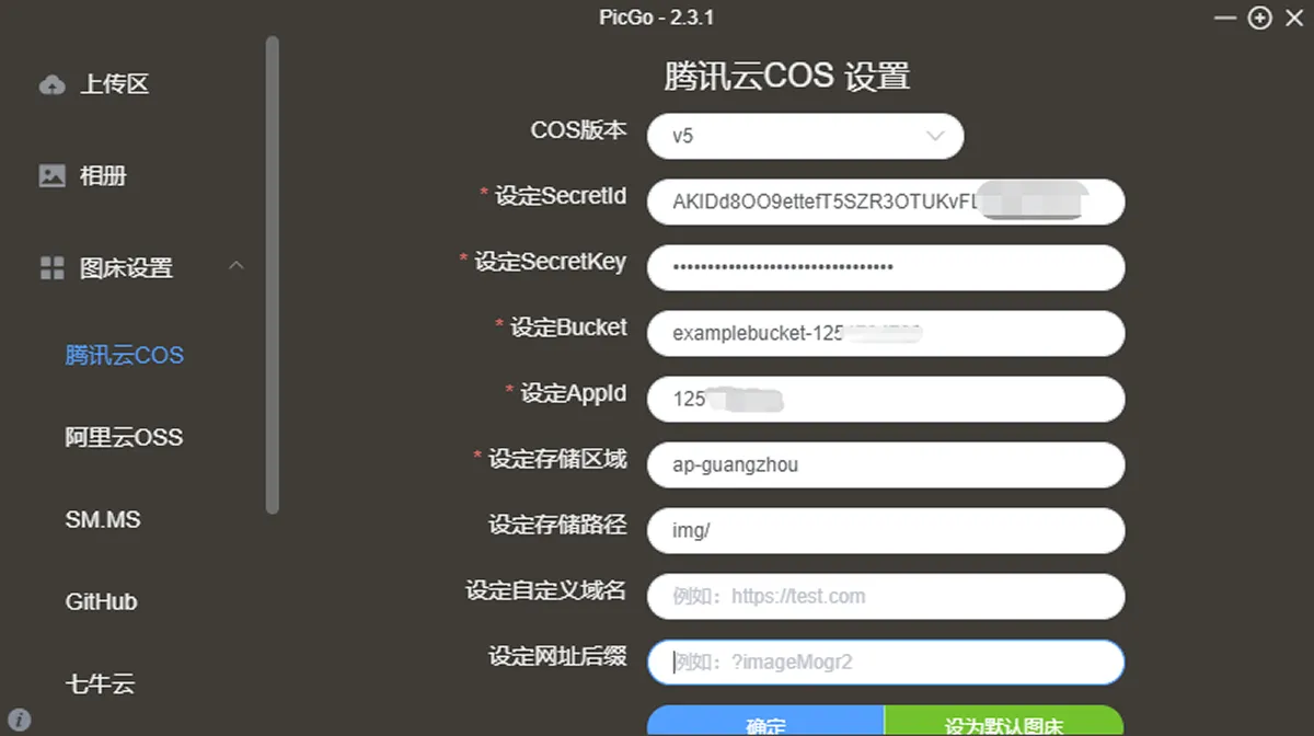 - 设定 AppId:开发者访问 COS 服务时拥有的用户维度唯一资源标识,用以标识资源,可在 API 密钥管理 页面获取。