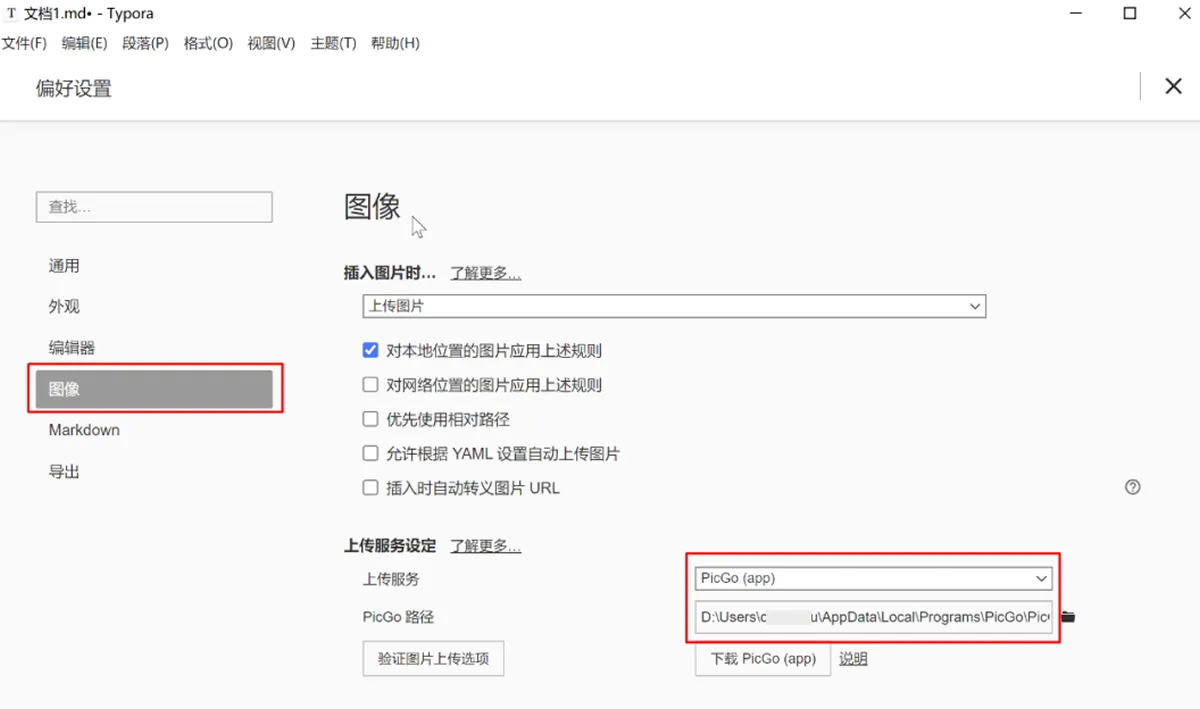 PicGo(app),并设置刚才安装的PicGo.exe位置。 - 重启 typora,使设置生效。